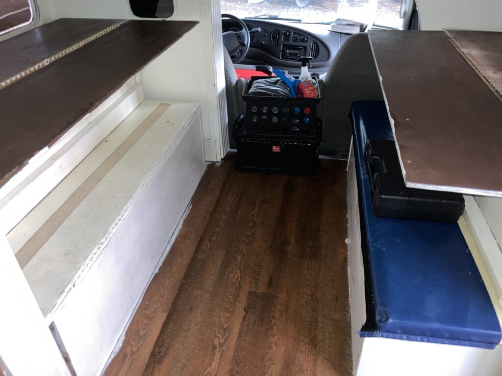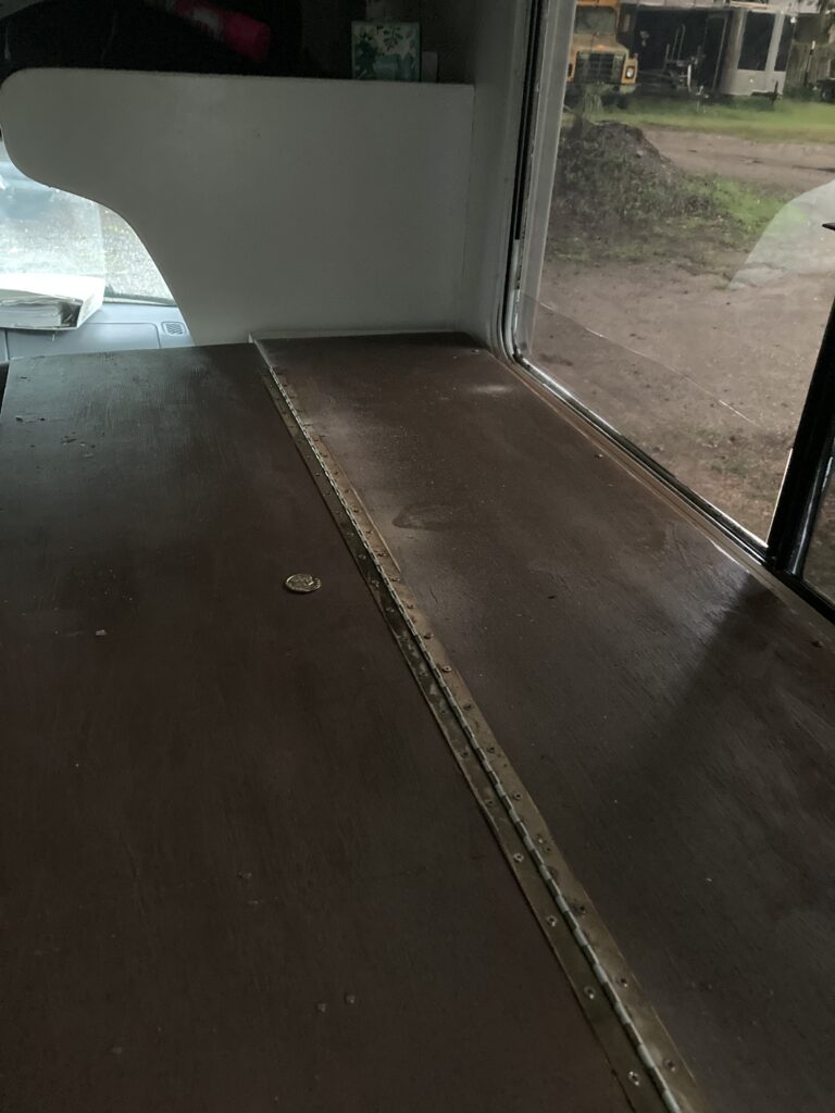 You can’t sit at these like a picnic table, this makes no sense! Eventually, after we got it home and really spent time opening and closing all the panels we could find with hinges, they appeared to be long bench seats whose seats could unfold and become a giant platform that, presumably, one could put a massive mattress on it and turn it into something like a king bed. I’m told that the previous owners had 9 children and the owners before that who built these strange pieces of furniture had 10 kids! So if you had to cram a dozen kids into an RV, I suppose building a set of long bench seats that converts into a puppy pile bed is one way to do it? But we never figured out what the top unfolding panels were for or how they were used.