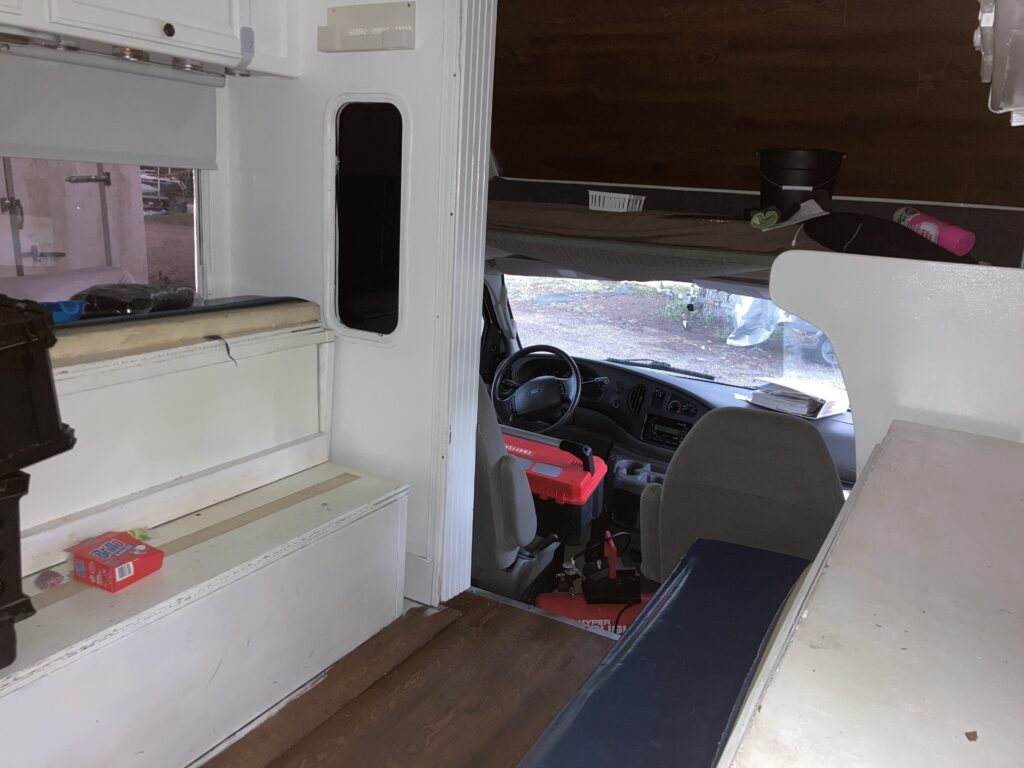 But then we saw this RV. Neither of us really knew what to make of it. The pictures the owner sent me really didn’t show us what to expect, and yet, it looked exactly like the pictures. The outside was simple enough – an older Class C motorhome with a cab-over loft that had been repainted by a previous owner (not a professional paint job) and had some black decals slapped on it. That’s fine.