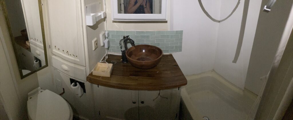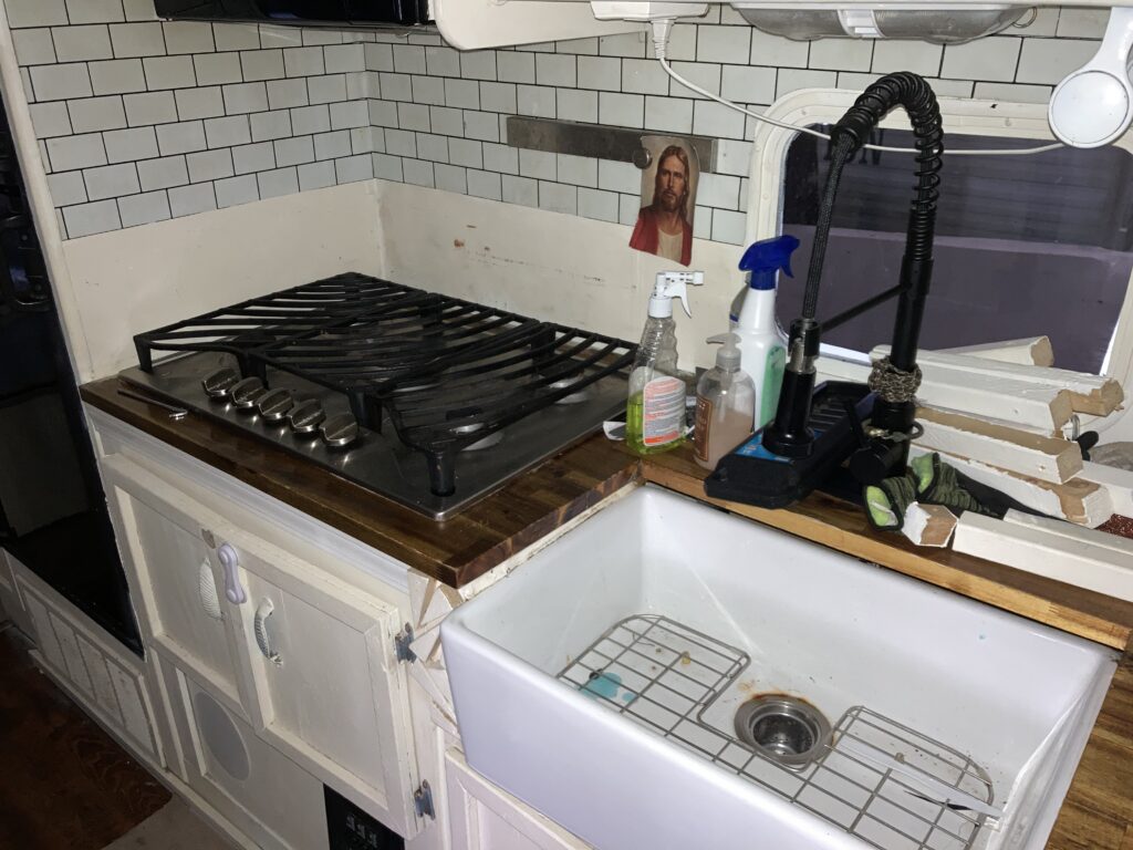 There is no counter space, but there usually isn’t in a motorhome. The sink comes with a butcher-block slab that fits exactly over the sink to provide some counter space, but I removed it to take a picture of the sink. The pre-previous owners had removed the factory appliances and put in their own, along with a custom-cut butcher-block counter. The gas stove was a thing of beauty. I prefer electric only because that’s all I’ve ever used, but I’m told I’ll start loving gas once I get used to it.