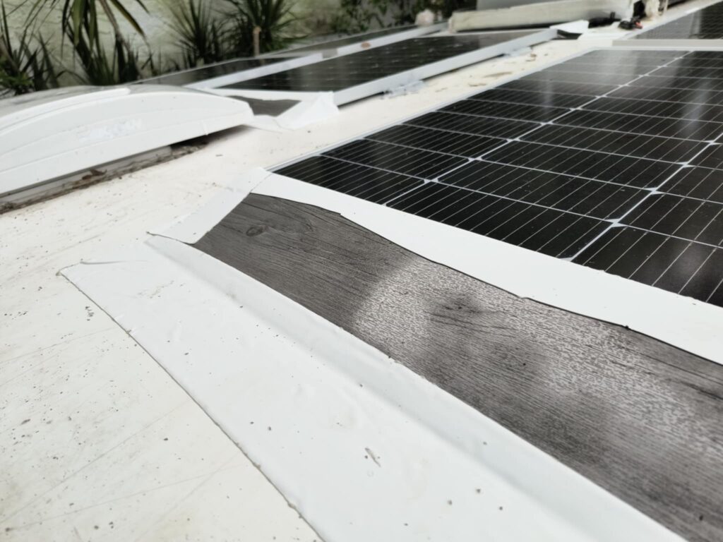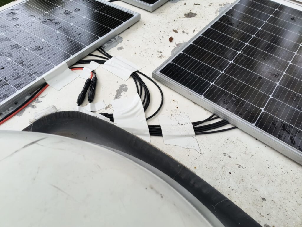 Using some super strong roof tape, David attached vinyl slabs cut to the width of the solar panels as a ramp from the roof to the top plane of the solar panel. This redirected the wind while driving to up and over the top of the panels, which actually pushes the panels back down onto the roof. David and I managed to get the last of the screw holes covered in lap sealant literally as the rain started to fall on the day before the trip. We threw the RV cover up over everything and moved inside to finish the work needed there. Which meant, of course, that we never had a chance to test the solar panels to see if they charged the batteries.