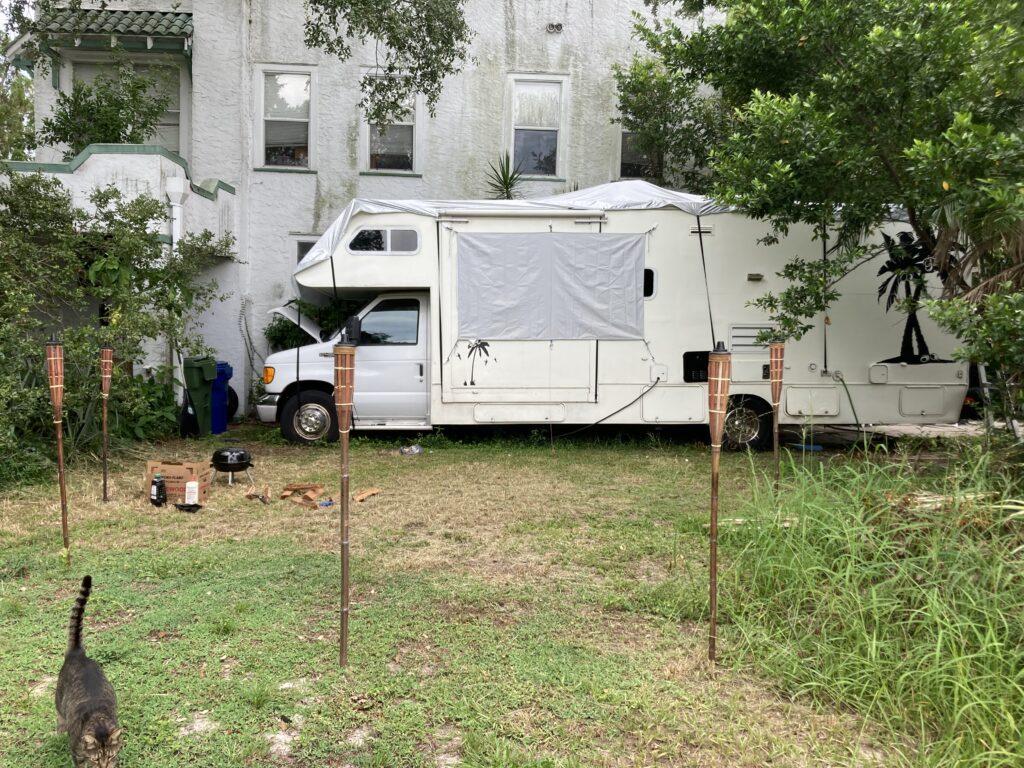 Anyway, I found some hooks and picked a spot to stretch the screen across. The RV was parked so that the starboard side was the accessible side. Normally I would want a movie screen on the port side, preferably under the awning, but there’s no reason I can’t have it set up both ways, for no matter which way the RV is parked at any given time.