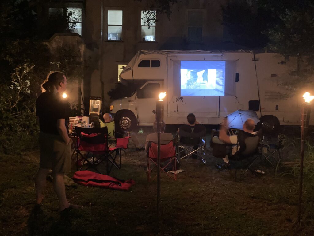I hung the screen, put out the Citronella tiki torches, Daniel gifted me with a new portable BBQ since the firepit had rusted out, wheeled my housemate’s movie theater popcorn machine, and set up the projector.