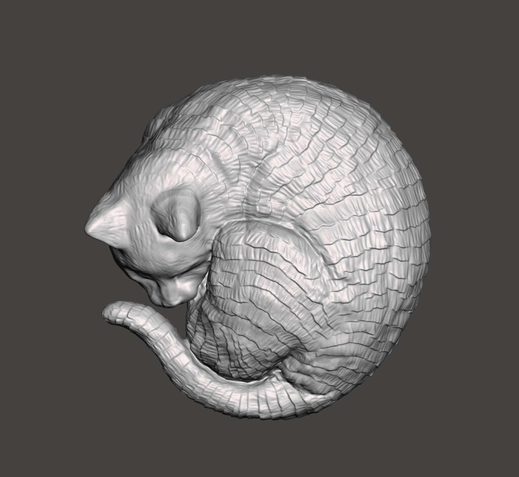 The color of these cats shifts as you move around the pieces and also as the light changes and moves, such as turning on or off different lights, or the sun moving through the windows. It’s always a different color pattern, but always blue, black, and purple.