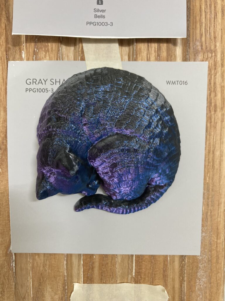 This eye-catching color would probably stand out against all the light white, grey, and marble! So I bought some, not knowing what I would use it for eventually, but knowing that I would use it. Then along came this ornamental moulding problem and voilá! I had a solution! After the test print in black, we printed one in the color-shifting filament and…
