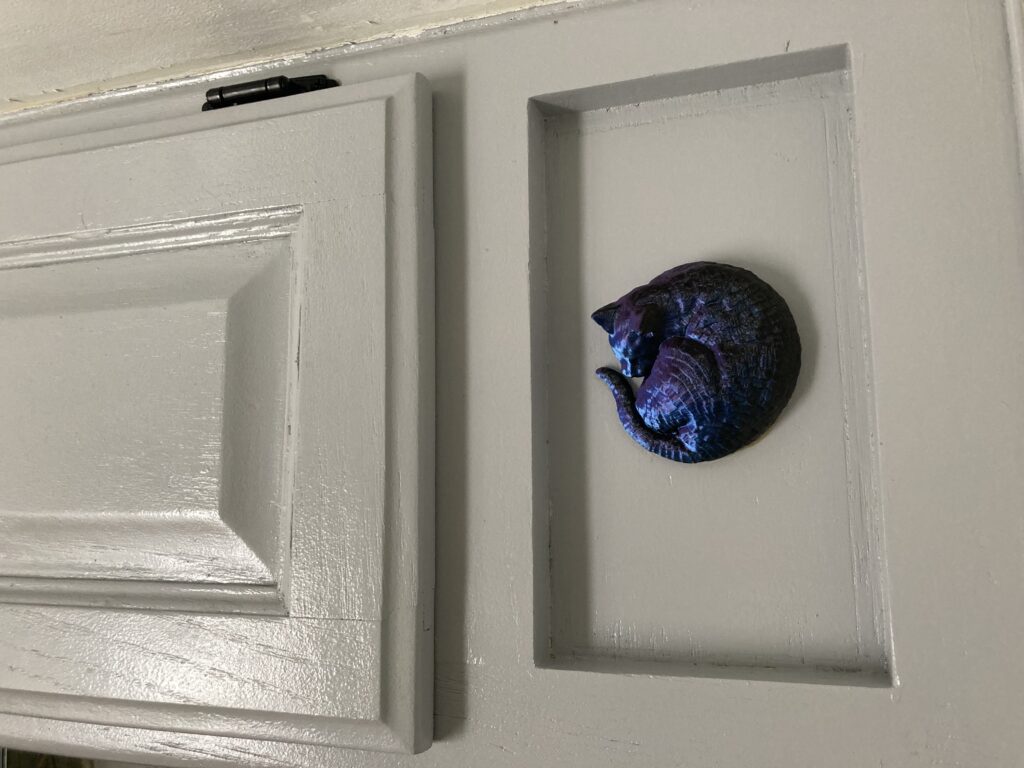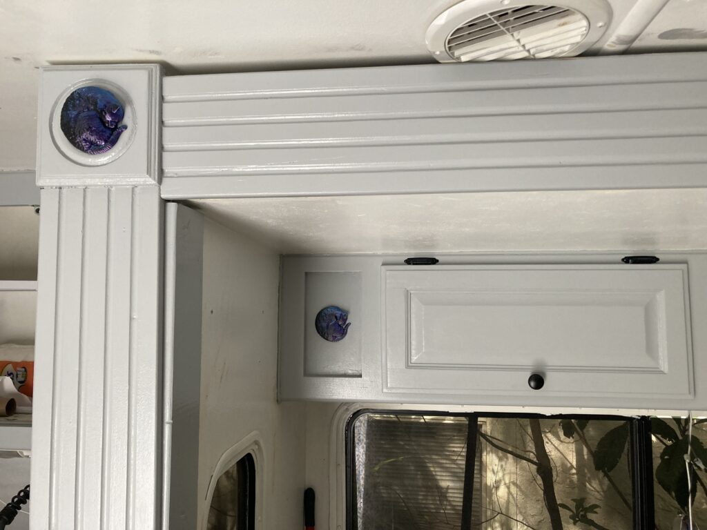 Success!!! These little sleeping cats turned out so adorable and they really pop on the grey background. After painting the slide-out trim, I couldn’t wait to put them up and see how they looked! I was not disappointed.