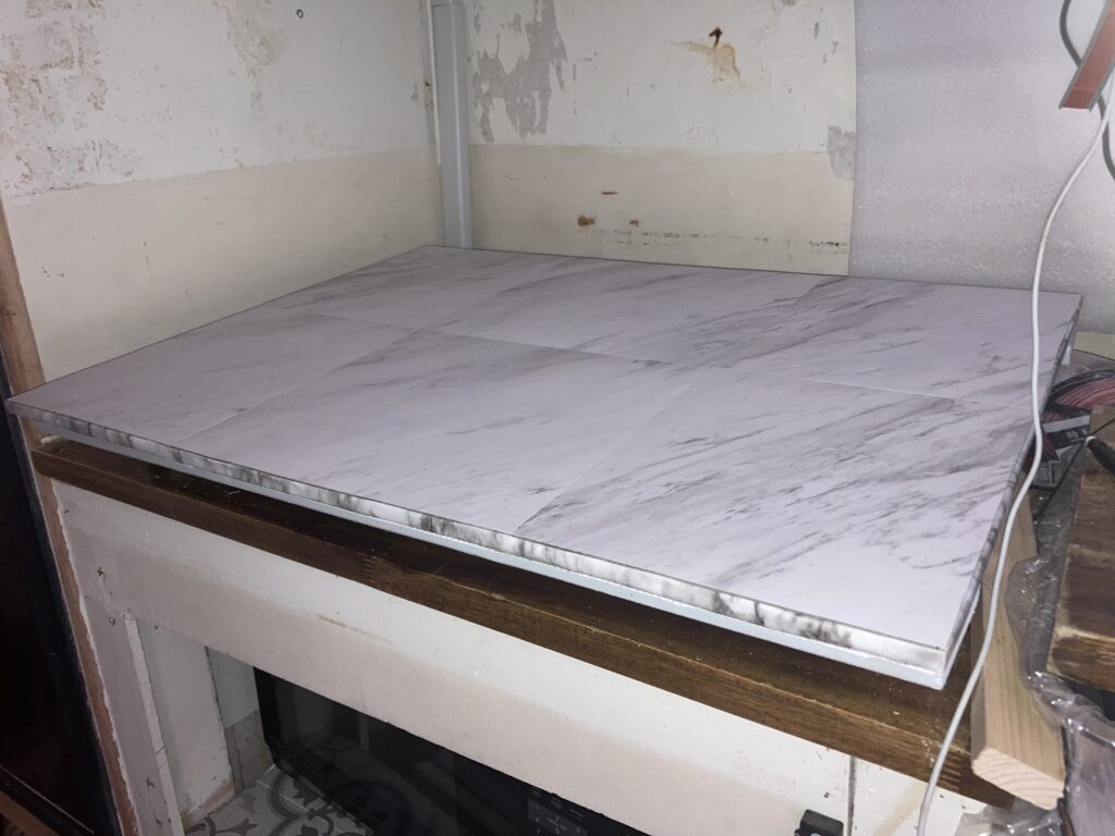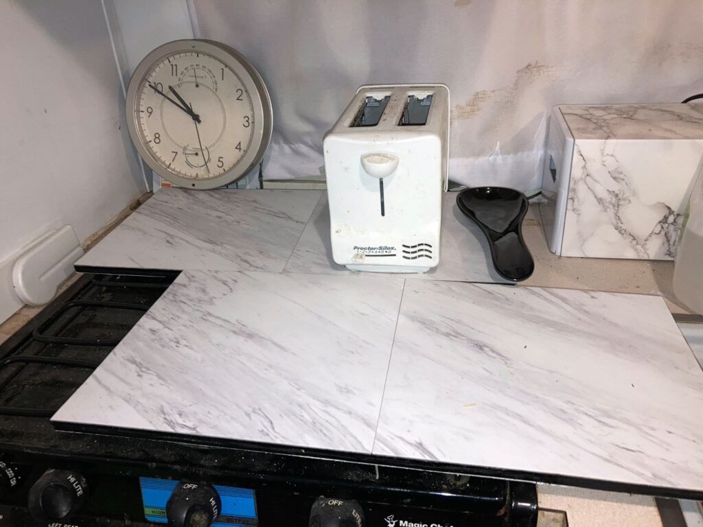 Here you can see that it’s literally just a piece of plywood with the edges painted black, vinyl floor tile on the top surface, and a marble patterned rubber shelf liner on the bottom to keep the boards from sliding and to protect the hobs from being scratched up.
