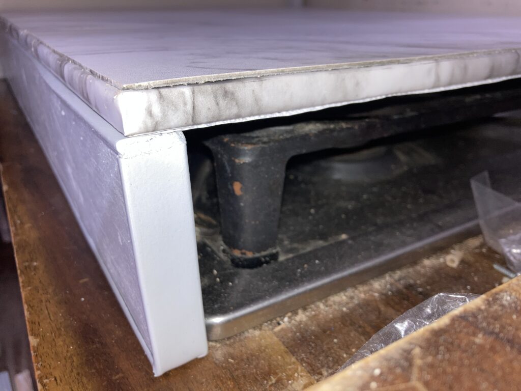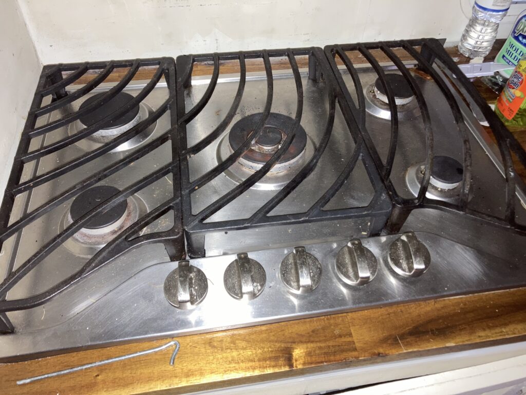 I’ve been living in The Void for 4 years with these cutting boards as my counter tops and I continue to be pleased with them. But what to do with the giant gas range in The Transit? I could do the same thing and just cut some plywood to fit on top, but as you can see in the first image, those grates are quite tall. and I still have that knob problem with igniting the strikers. That was not a problem with my electric range in The Void.