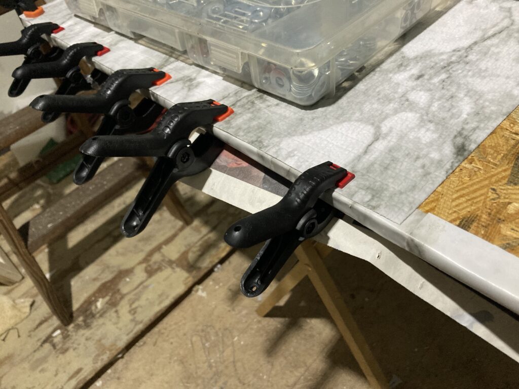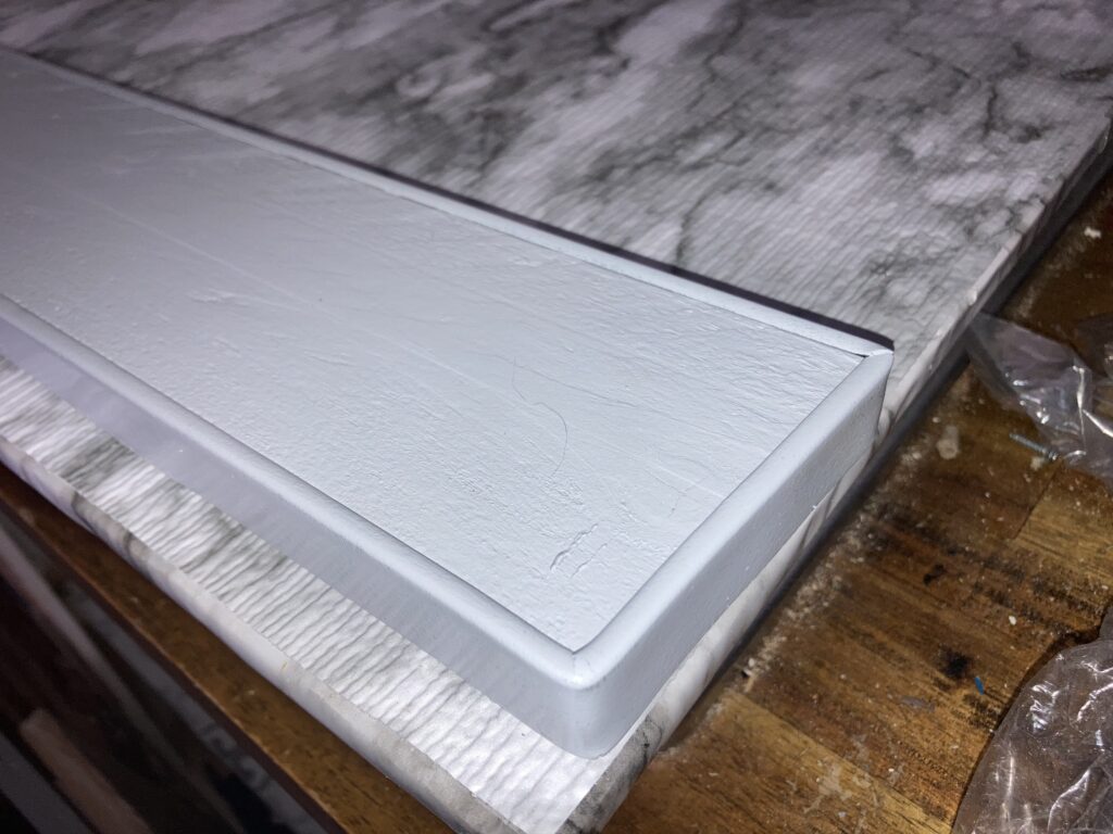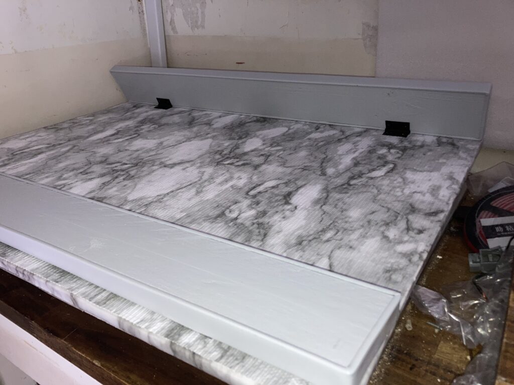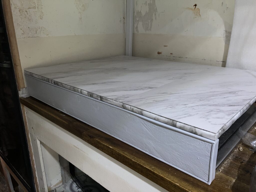 Next I glued the marble rubber shelf liner to the underside, same as the original in The Void. The legs keep the platform off the grates but only barely, and I just felt safer having the underside covered with a nice, soft, rubber liner. Instead of painting the edges black, like I did with the original “cutting boards”, I chose to cover the edges in an adhesive marble shelf liner paper, like I did for the counter tops and tables in The Void.