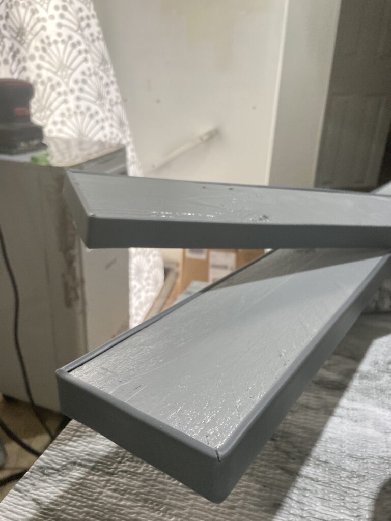 Finally, the legs. First, I decided to paint the legs the same grey as the rest of the cupboards and trim. I attached them to the platform, but it still looked unfinished to me. I spend a lot of time just window shopping online for building materials and storage options and household stuff, so the algorithms have started showing me related items, some of which look really useful or give me ideas.